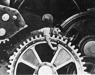 Even Chaplin’s character’s bathroom break is short lived, interrupted by the boss man on the giant screen. It takes Chaplin falling into the bowels of the machinery itself for an opportunity for a break, but by then, he’s lost his ability to differentiate between work and play. His nervous breakdown is not surprising.